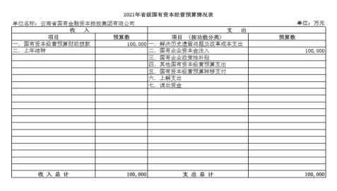 根據(jù)《云南省財(cái)政廳關(guān)于批復(fù)云南省國有金融資本控股集團(tuán)有限公司2021年省級(jí)國有資本經(jīng)營預(yù)算的通知》(云財(cái)金〔2021〕18號(hào))要求,現(xiàn)將我公司2021年國有資本經(jīng)營預(yù)算情況公示如下: