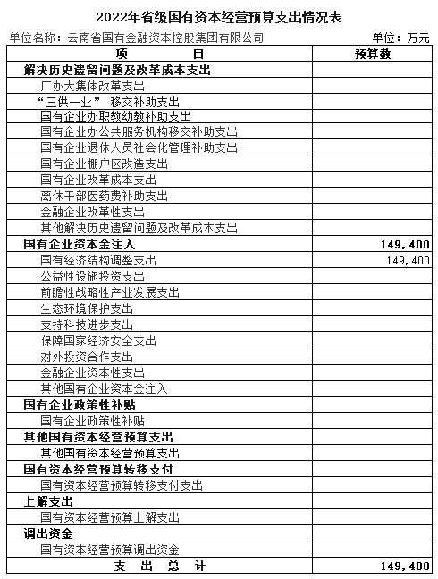 ?根據(jù)《云南省財政廳關(guān)于批復(fù)2022年省級國有資本經(jīng)營預(yù)算的通知》(云財資〔2022〕1號)要求,現(xiàn)將我公司2022年國有資本經(jīng)營預(yù)算情況公示如下: