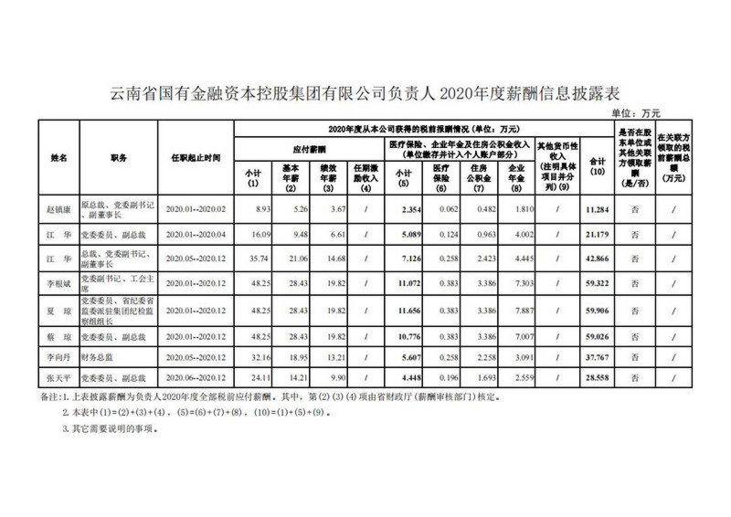 云南省國(guó)有金融資本控股集團(tuán)有限公司負(fù)責(zé)人2020年度薪酬信息披露表