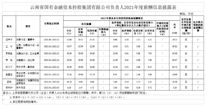 云南省國有金融資本控股集團有限公司負責人2021年度薪酬信息披露表