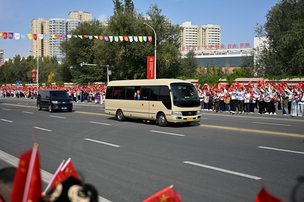 9月23日下午,中共中央總書(shū)記、國(guó)家主席、中央軍委主席習(xí)近平率中央代表團(tuán)乘專機(jī)抵達(dá)烏魯木齊,出席新疆維吾爾自治區(qū)成立70周年慶?;顒?dòng)。這是從機(jī)場(chǎng)到住地途中,習(xí)近平向沿途歡迎的群眾揮手致意。新華社記者 辛悅衛(wèi) 攝