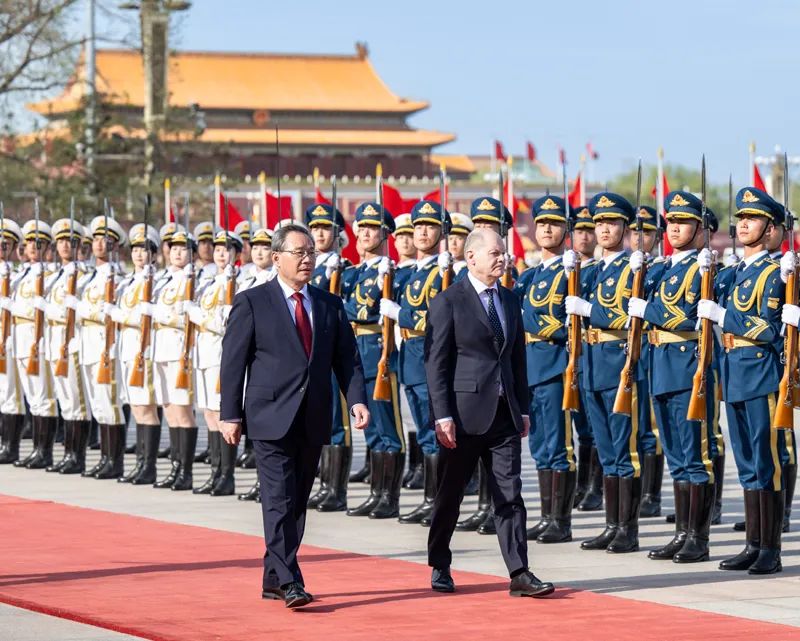會(huì)談前,李強(qiáng)在人民大會(huì)堂東門外廣場為朔爾茨舉行歡迎儀式。