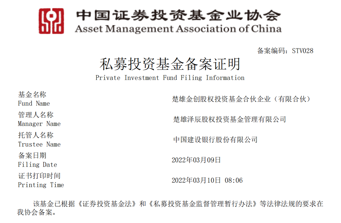 楚雄金創(chuàng)基金成功完成中基協(xié)備案登記