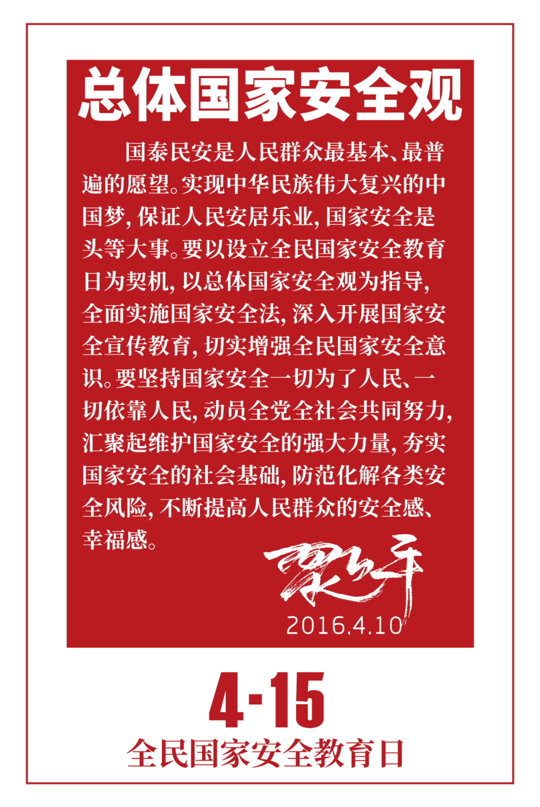 2021年是中國共產(chǎn)黨成立100周年,也是“十四五”開局之年,4月15日將迎來第六個全民國家安全教育日?;顒又黝}是“踐行總體國家安全觀,統(tǒng)籌發(fā)展和安全,統(tǒng)籌傳統(tǒng)安全和非傳統(tǒng)安全,營造慶祝建黨100周年良好氛圍”。
