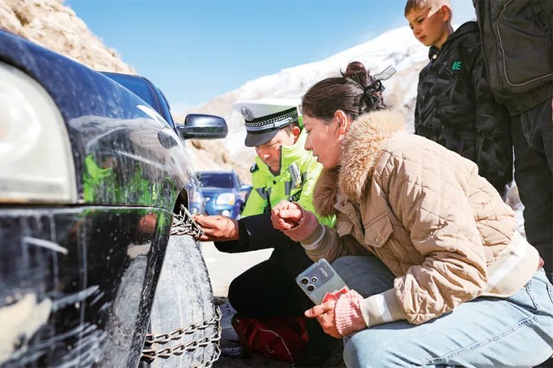 多年來,當(dāng)學(xué)生寒暑假大規(guī)模返校和回家時(shí),新疆葉城縣都會組織黨員干部帶隊(duì),動(dòng)員縣、鄉(xiāng)、村三級力量,用心用情守護(hù)上學(xué)路。圖為2024年2月22日,在前往西合休鄉(xiāng)中心小學(xué)翻越海拔4000多米的雪山途中,駕駛員和葉城縣公安局交通管理大隊(duì)工作人員一起為接送學(xué)生的車輛安裝防滑鏈。 新華社記者 胡虎虎/攝