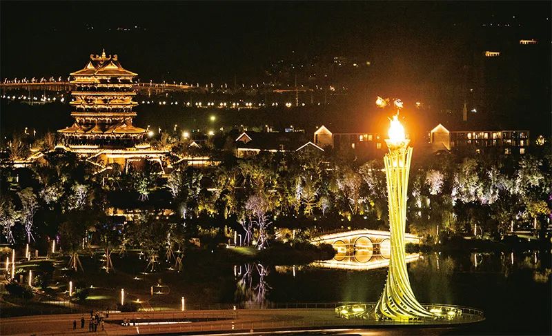 2023年7月28日晚,第31屆世界大學(xué)生夏季運動會開幕式在成都東安湖體育公園主體育場舉行。這是成都大運會主火炬。 新華社記者 曹祎銘/攝