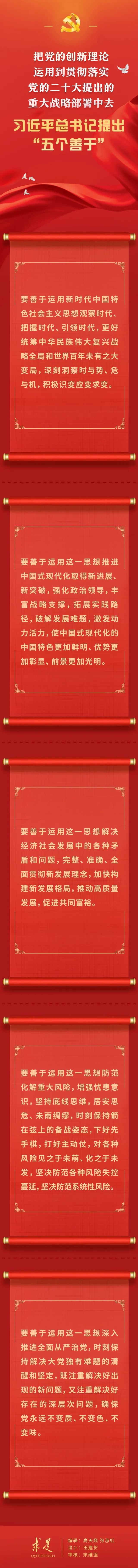 把黨的創(chuàng)新理論運(yùn)用到貫徹落實(shí)黨的二十大提出的重大戰(zhàn)略部署中去,習(xí)近平總書記提出“五個(gè)善于”