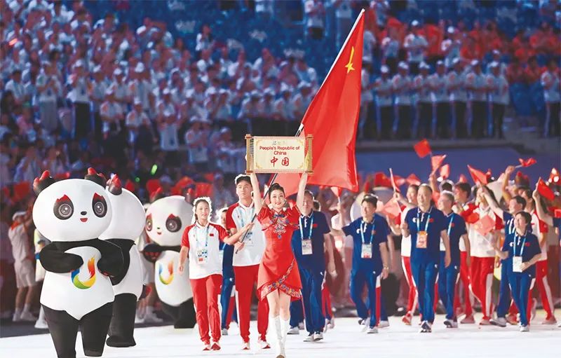 2023年7月28日,第31屆世界大學(xué)生夏季運動會開幕式在成都東安湖體育公園主體育場舉行。圖為中國大學(xué)生體育代表團在開幕式上入場。新華社記者 王曦/攝
