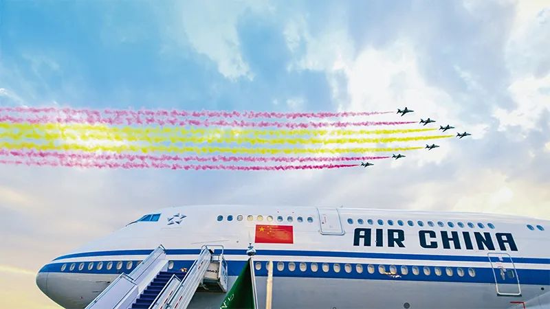 圖為2022年12月7日,國(guó)家主席習(xí)近平抵達(dá)沙特阿拉伯首都利雅得時(shí),禮賓護(hù)衛(wèi)機(jī)在空中拉出象征中國(guó)國(guó)旗的紅黃兩色彩帶。新華社記者 謝環(huán)馳/攝