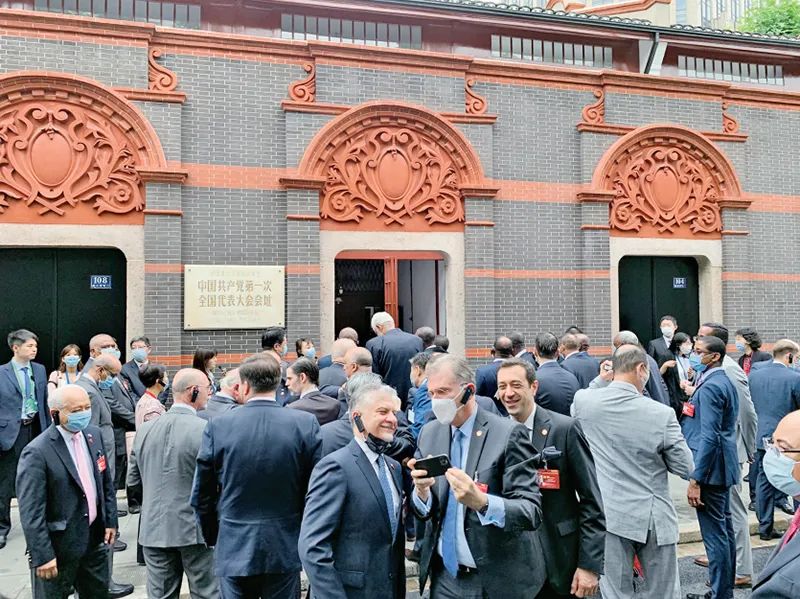 2021年6月16日,“中國共產(chǎn)黨的故事——習(xí)近平新時(shí)代中國特色社會主義思想在上海的實(shí)踐”特別對話會在上海舉行。近100個(gè)國家、126個(gè)政黨和友好組織的740多名代表通過視頻連線參加對話會,40多個(gè)國家駐華大使現(xiàn)場出席會議。圖為與會駐華使節(jié)參觀中共一大會址。 人民網(wǎng) 馬作鵬/攝