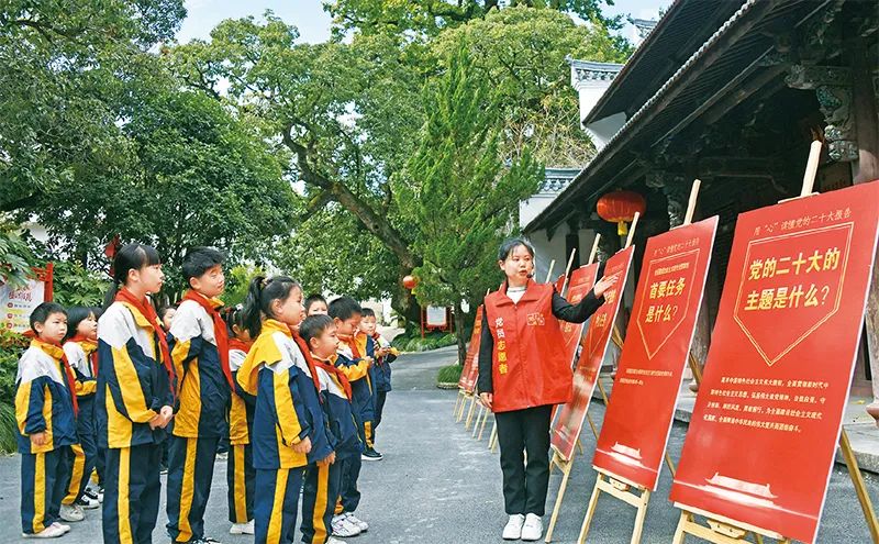 ?圖為2022年10月25日,浙江省臺州市上張鄉(xiāng)中心小學的學生在中共仙居縣委舊址紀念館學習黨的二十大精神。 人民視覺 王華斌/攝