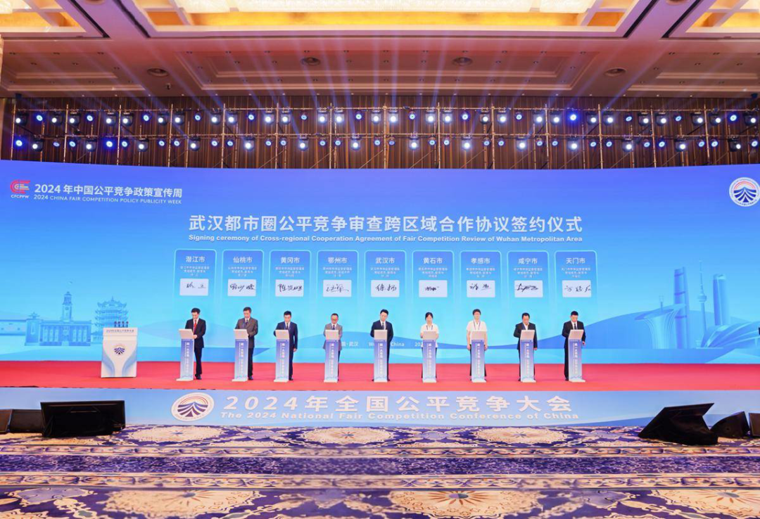 2024年9月10日至11日,由國(guó)家市場(chǎng)監(jiān)督管理總局主辦的2024年全國(guó)公平競(jìng)爭(zhēng)大會(huì)在湖北省武漢市舉行,大會(huì)主題為“統(tǒng)一大市場(chǎng) 公平競(jìng)未來(lái)”。圖為9月11日,武漢、黃石、鄂州、孝感、黃岡、咸寧、天門、仙桃、潛江等9個(gè)城市代表,現(xiàn)場(chǎng)簽訂公平競(jìng)爭(zhēng)審查跨區(qū)域合作協(xié)議。? ?湖北省市場(chǎng)監(jiān)管局供圖