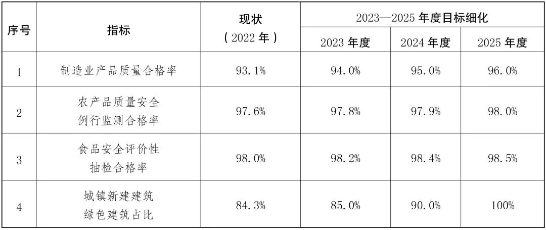 到2025年,新產(chǎn)品、新業(yè)態(tài)蓬勃發(fā)展,產(chǎn)品、工程、服務質(zhì)量水平顯著改善,制造業(yè)產(chǎn)品質(zhì)量合格率提高到96%,農(nóng)產(chǎn)品質(zhì)量安全例行監(jiān)測合格率達到98%以上,食品安全評價性抽檢合格率保持在98.5%以上,工程質(zhì)量抽查符合率不斷提高,城鎮(zhèn)新建建筑綠色建筑占比達到100%。