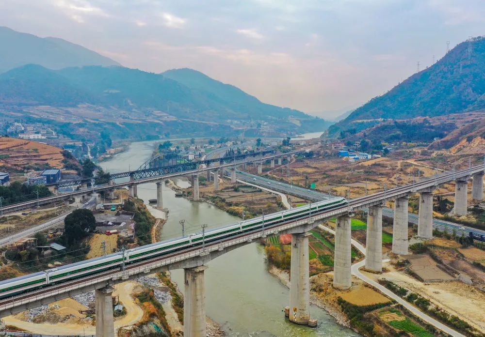 ?2022年12月26日,蜿蜒千里的新成昆鐵路全線貫通運(yùn)營。復(fù)興號(hào)動(dòng)車組從成都南站發(fā)出,沿著現(xiàn)代化的鐵路,奔馳在崇山峻嶺間。