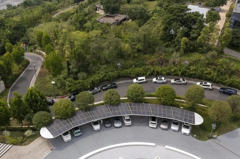 ?2022年6月16日拍攝的已建成投用的重慶首座光伏充電發(fā)用一體充電站(無人機(jī)照片)。新華社記者 劉潺 攝