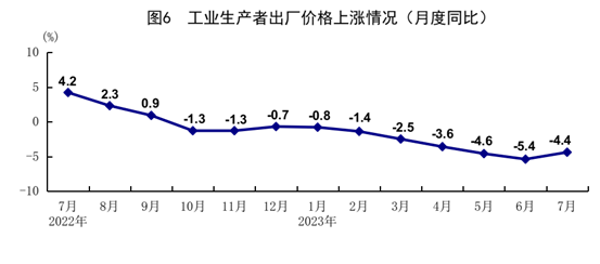 7月份,全國(guó)工業(yè)生產(chǎn)者出廠價(jià)格同比下降4.4%,降幅比上月收窄1.0個(gè)百分點(diǎn);環(huán)比下降0.2%。全國(guó)工業(yè)生產(chǎn)者購(gòu)進(jìn)價(jià)格同比下降6.1%,降幅比上月收窄0.4個(gè)百分點(diǎn);環(huán)比下降0.5%。1-7月份,全國(guó)工業(yè)生產(chǎn)者出廠價(jià)格和購(gòu)進(jìn)價(jià)格同比分別下降3.2%和3.5%。