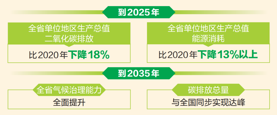 ?根據(jù)《規(guī)劃》,到2025年,全省單位地區(qū)生產(chǎn)總值二氧化碳排放比2020年下降18%,全省單位地區(qū)生產(chǎn)總值能源消耗比2020年下降13%以上。產(chǎn)業(yè)結(jié)構(gòu)和能源結(jié)構(gòu)進(jìn)一步優(yōu)化、適應(yīng)氣候變化能力不斷提升、試點(diǎn)示范取得顯著進(jìn)展、氣候治理能力取得重要成果?!兑?guī)劃》展望了2035年遠(yuǎn)景目標(biāo)。2035年全省氣候治理能力全面提升,碳排放總量已與全國同步實(shí)現(xiàn)達(dá)峰,經(jīng)濟(jì)社會(huì)已穩(wěn)步進(jìn)入高質(zhì)量發(fā)展階段,中國最美麗省份全面建成。