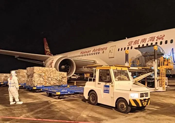?11月24日,??诿捞m國際機(jī)場的工作人員在停機(jī)坪裝運(yùn)貨物。次日凌晨,海口—法蘭克??透呢浂ㄆ谥揠H航線正式恢復(fù)。新華社發(fā)