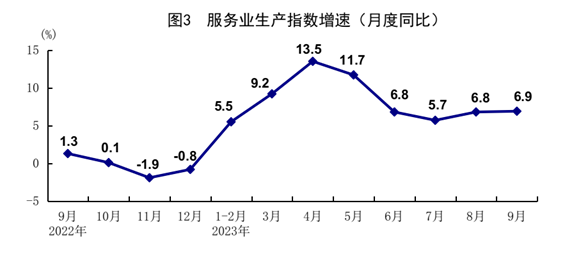 前三季度,服務(wù)業(yè)增加值同比增長6.0%。其中,住宿和餐飲業(yè),信息傳輸、軟件和信息技術(shù)服務(wù)業(yè),租賃和商務(wù)服務(wù)業(yè),交通運(yùn)輸、倉儲(chǔ)和郵政業(yè),金融業(yè)增加值分別增長14.4%、12.1%、9.5%、7.5%、7.0%。9月份,服務(wù)業(yè)生產(chǎn)指數(shù)同比增長6.9%,比上月加快0.1個(gè)百分點(diǎn),增速連續(xù)2個(gè)月回升。其中,住宿和餐飲業(yè),信息傳輸、軟件和信息技術(shù)服務(wù)業(yè),交通運(yùn)輸、倉儲(chǔ)和郵政業(yè)生產(chǎn)指數(shù)分別增長17.7%、11.3%、9.3%。1-8月份,全國規(guī)模以上服務(wù)業(yè)企業(yè)營業(yè)收入同比增長7.2%。9月份,服務(wù)業(yè)商務(wù)活動(dòng)指數(shù)為50.9%,比上月上升0.4個(gè)百分點(diǎn);業(yè)務(wù)活動(dòng)預(yù)期指數(shù)為58.1%。其中,水上運(yùn)輸、郵政、電信廣播電視及衛(wèi)星傳輸服務(wù)、互聯(lián)網(wǎng)軟件及信息技術(shù)服務(wù)、貨幣金融服務(wù)等行業(yè)商務(wù)活動(dòng)指數(shù)位于55.0%以上較高景氣區(qū)間。