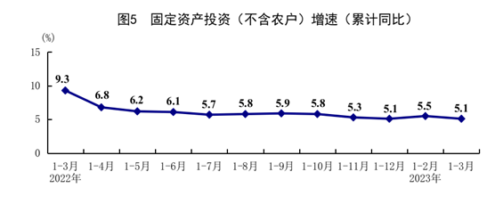 一季度,全國(guó)固定資產(chǎn)投資(不含農(nóng)戶)107282億元,同比增長(zhǎng)5.1%,與上年全年持平。分領(lǐng)域看,基礎(chǔ)設(shè)施投資增長(zhǎng)8.8%,制造業(yè)投資增長(zhǎng)7.0%,房地產(chǎn)開(kāi)發(fā)投資下降5.8%。全國(guó)商品房銷(xiāo)售面積29946萬(wàn)平方米,下降1.8%;商品房銷(xiāo)售額30545億元,增長(zhǎng)4.1%。分產(chǎn)業(yè)看,第一產(chǎn)業(yè)投資增長(zhǎng)0.5%,第二產(chǎn)業(yè)投資增長(zhǎng)8.7%,第三產(chǎn)業(yè)投資增長(zhǎng)3.6%。民間投資增長(zhǎng)0.6%。高技術(shù)產(chǎn)業(yè)投資增長(zhǎng)16.0%,其中高技術(shù)制造業(yè)和高技術(shù)服務(wù)業(yè)投資分別增長(zhǎng)15.2%、17.8%。高技術(shù)制造業(yè)中,電子及通信設(shè)備制造業(yè)、醫(yī)療儀器設(shè)備及儀器儀表制造業(yè)投資分別增長(zhǎng)20.7%、19.9%;高技術(shù)服務(wù)業(yè)中,電子商務(wù)服務(wù)業(yè)、科技成果轉(zhuǎn)化服務(wù)業(yè)投資分別增長(zhǎng)51.5%、51.3%。社會(huì)領(lǐng)域投資增長(zhǎng)8.3%,其中衛(wèi)生、教育投資分別增長(zhǎng)21.6%、6.2%。3月份,固定資產(chǎn)投資(不含農(nóng)戶)環(huán)比下降0.25%。